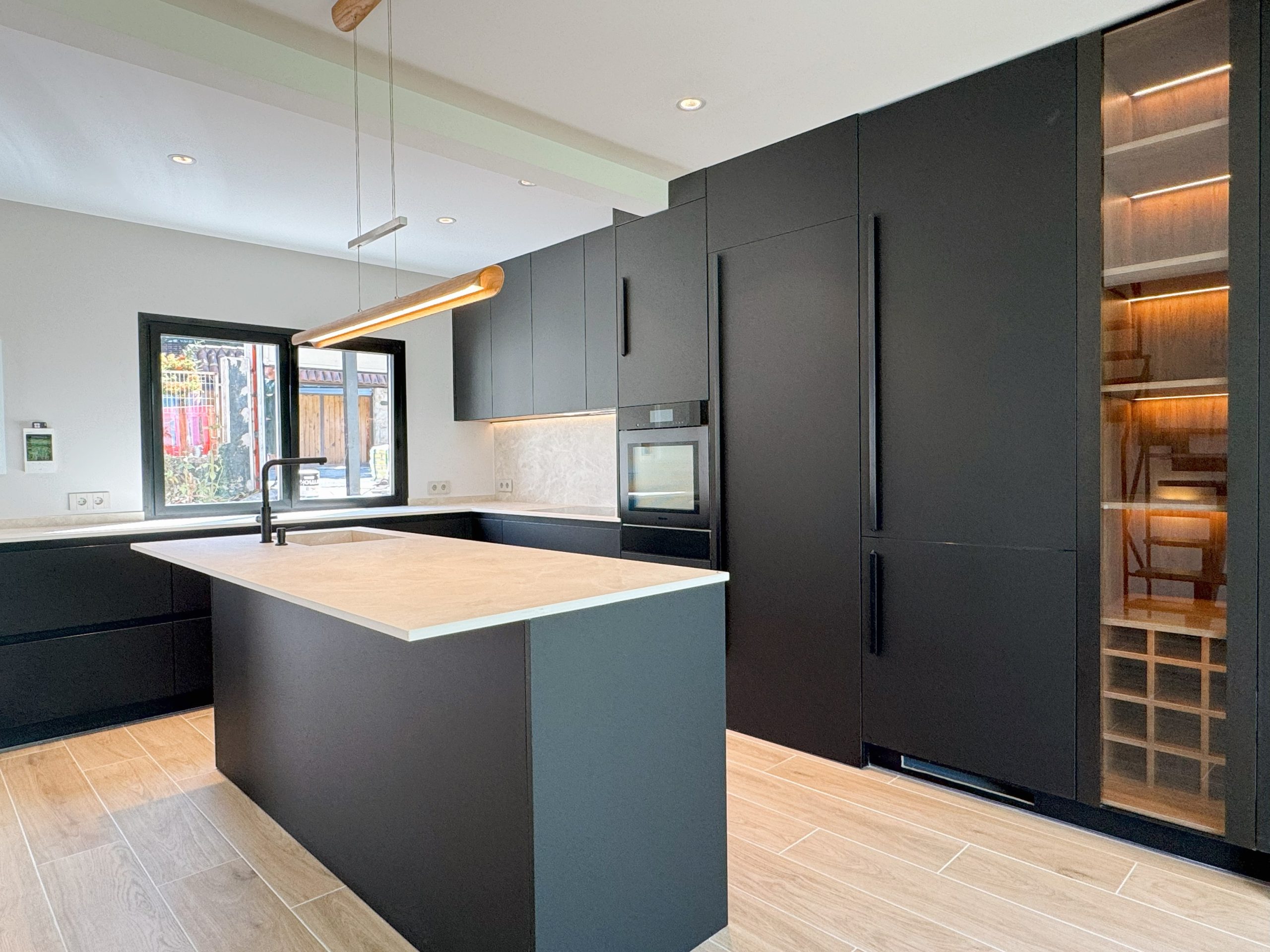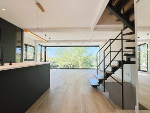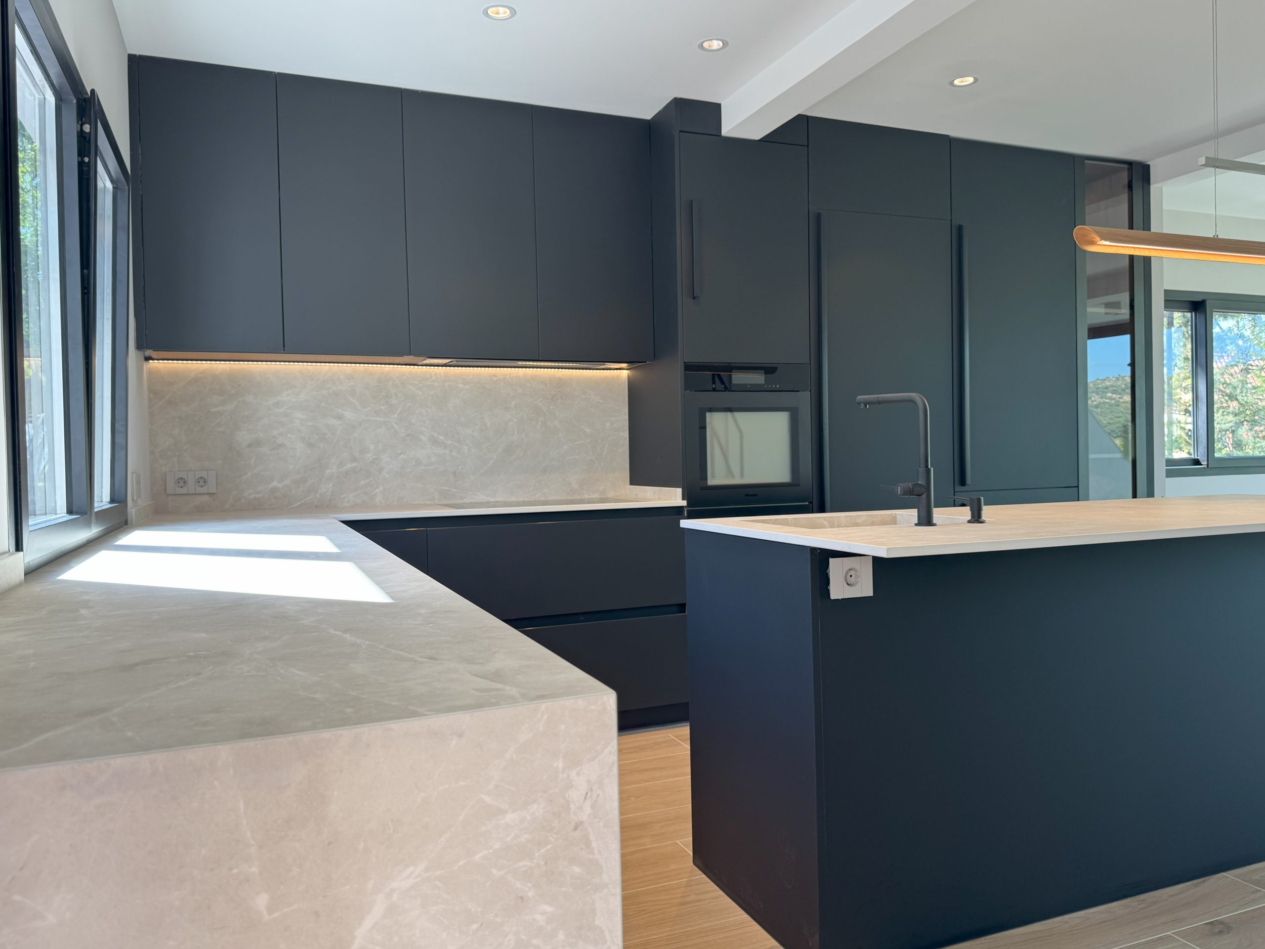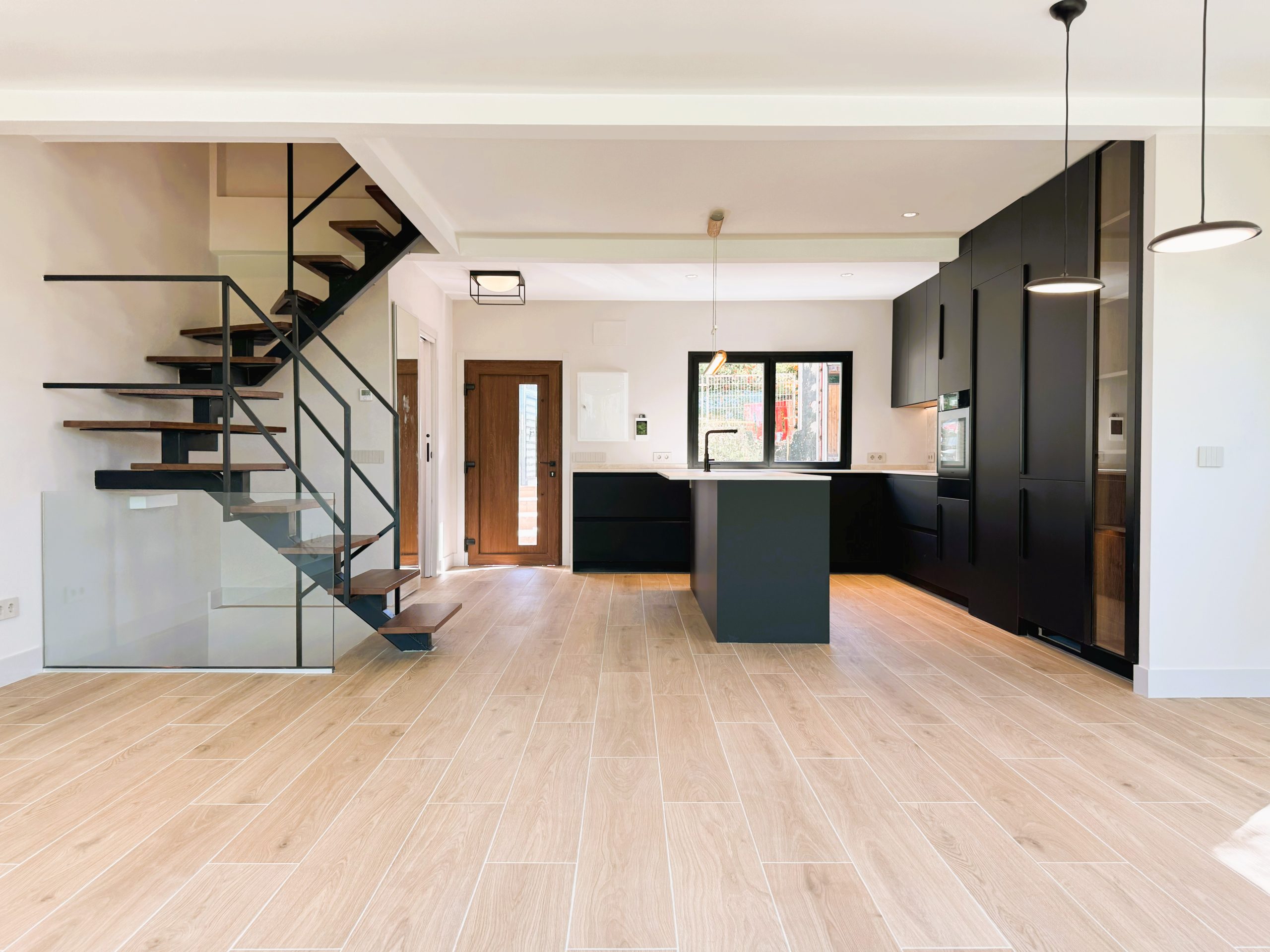 En la planta de acceso se apostó por la apertura total de la cocina al salón, generando un espacio diáfano, funcional y pensado para la vida familiar. En el salón se incorporó un fijo acristalado de gran formato, introducido mediante grúa, que potencia la entrada de luz natural y la relación con el exterior.