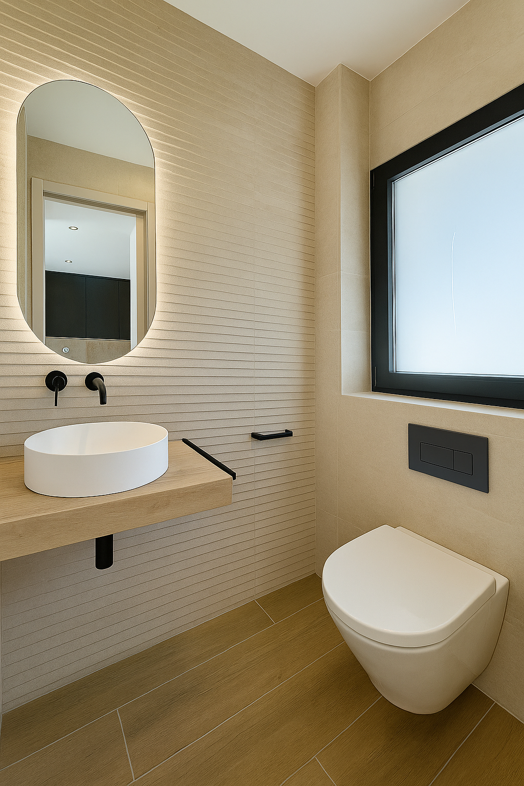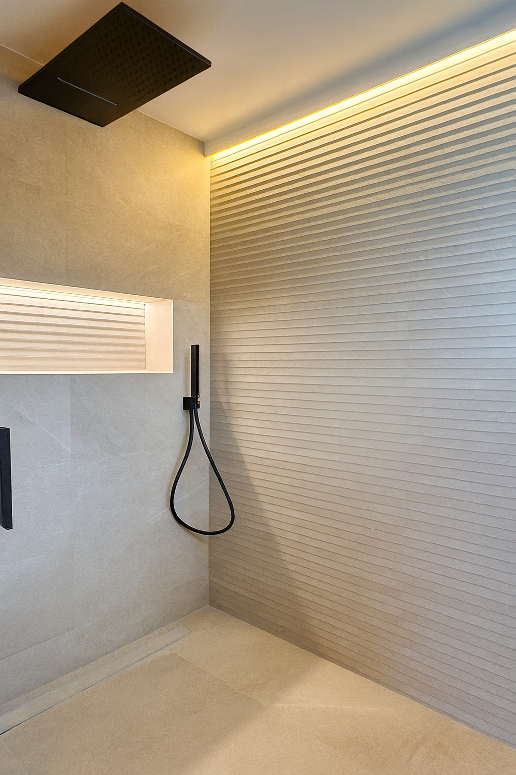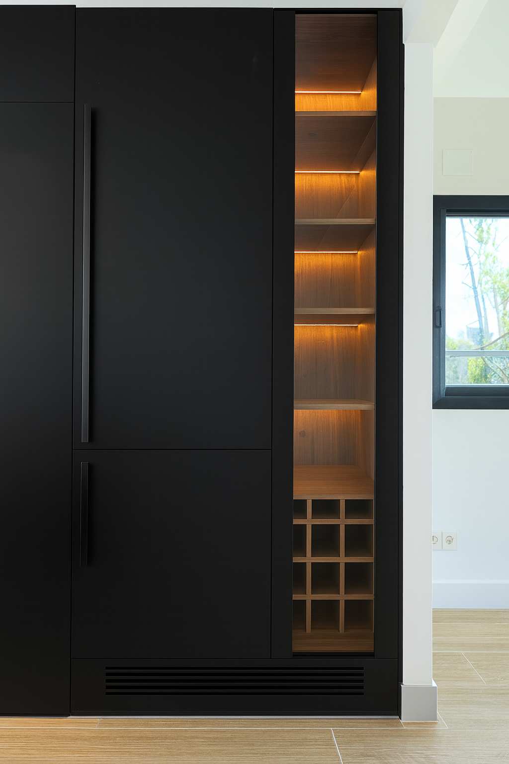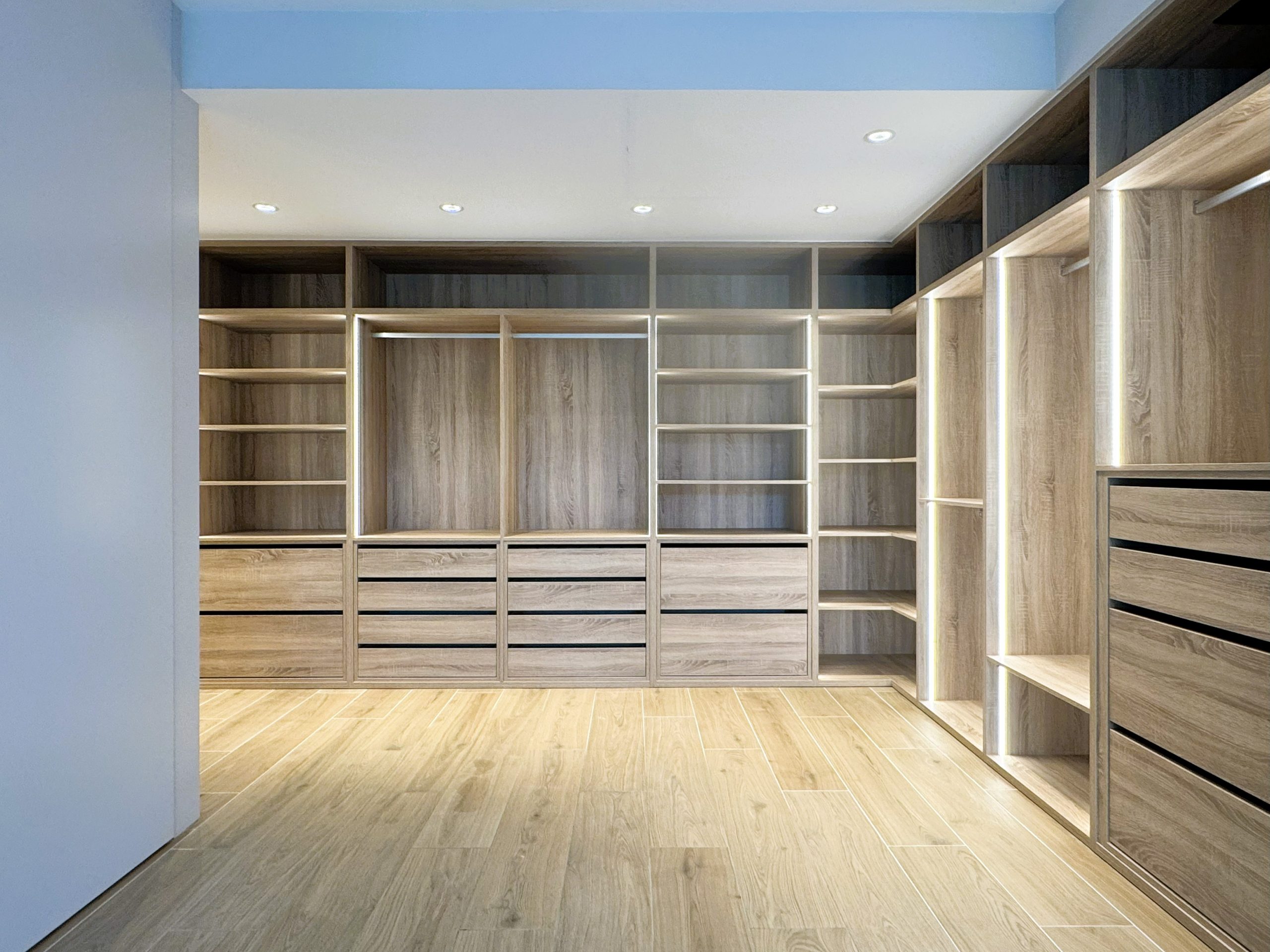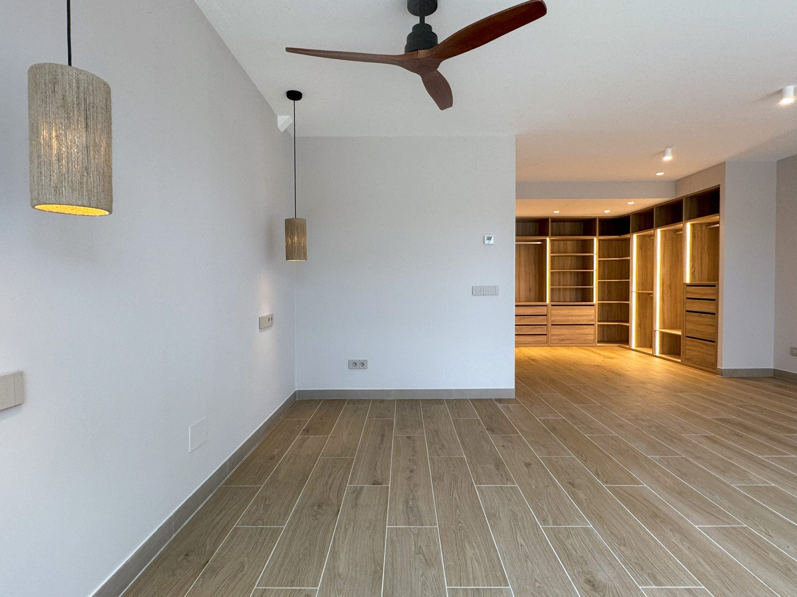 La planta superior se reorganizó para la niña, incorporando dormitorio, baño propio y un despacho familiar. La planta -1 se destinó al dormitorio principal, diseñado como una suite con vestidor abierto en madera e iluminación LED integrada, aportando calidez y sofisticación.