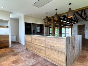La antigua cocina se integró por completo en el salón, generando un gran ambiente diáfano y social, donde la encimera de cuarzo natural se convierte en uno de los elementos más destacables de la reforma, aportando elegancia, resistencia y un carácter muy especial al conjunto.