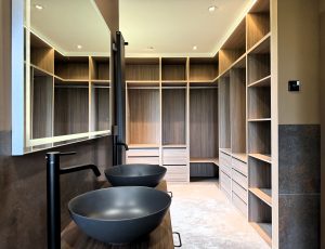 El dormitorio principal se diseñó como una estancia destacada, conectada visualmente con un baño-vestidor abierto de estética cuidada y muy llamativa.